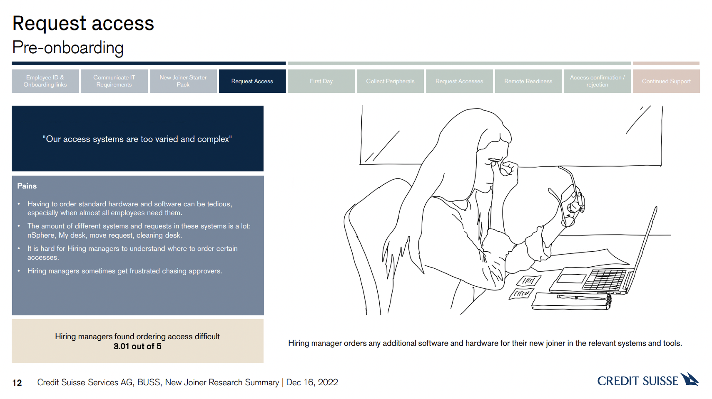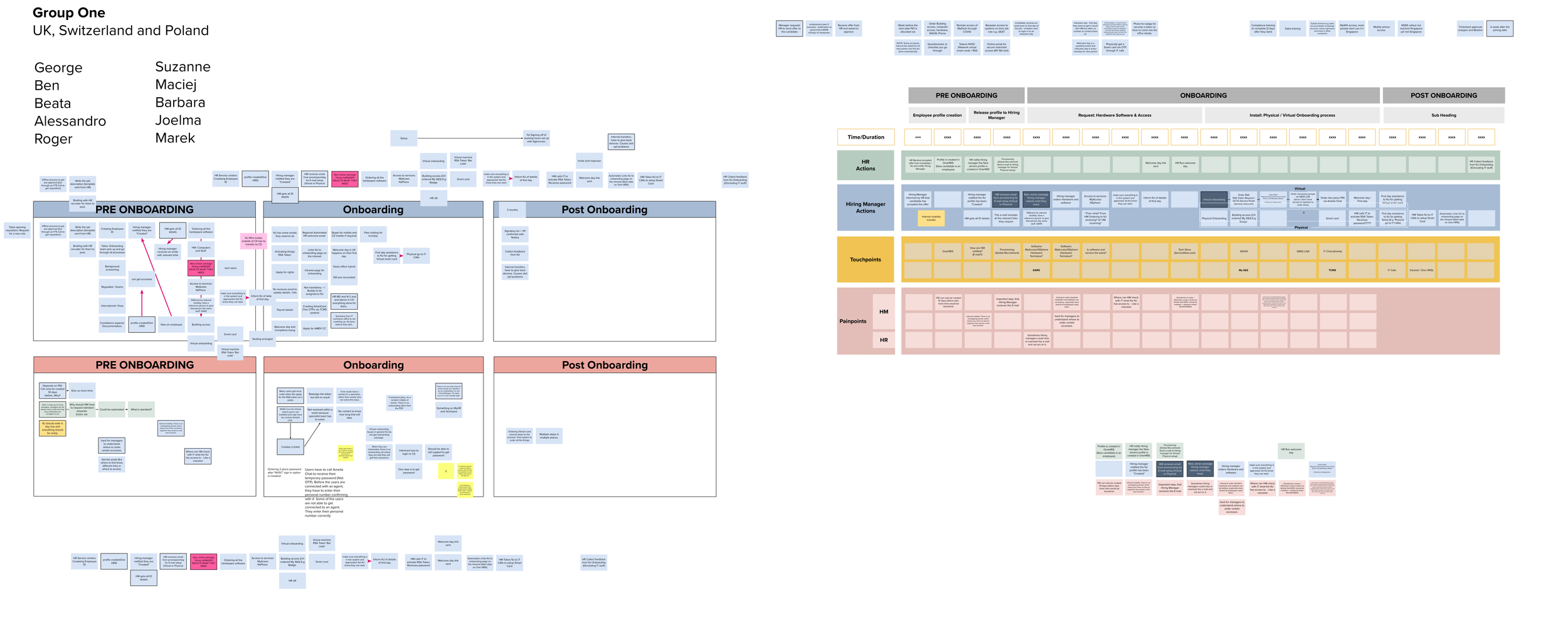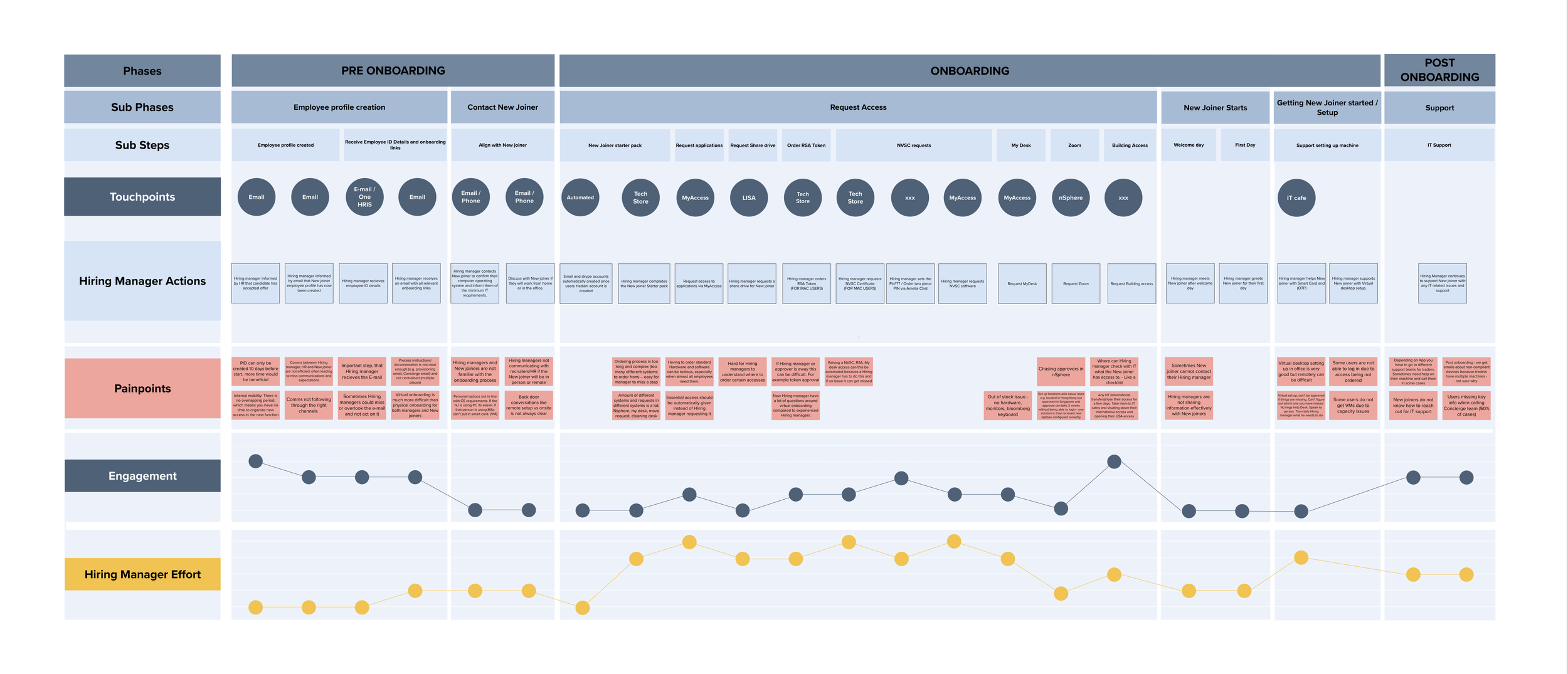 To gather insight into the current processes and experiences of the key stakeholders (New joiners, Hiring managers and HR) I ran a series of journey mapping workshops to capture what the current processes look like, and where the common pinpoints are. I did this across regions to get a truly global picture and also identify regional differences.