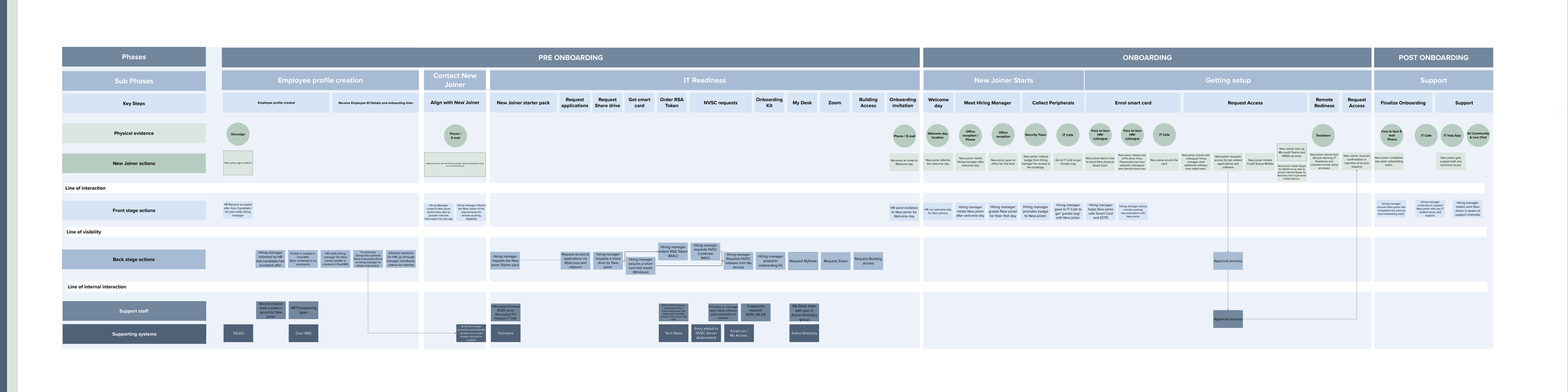 These workshops provided rich, quantitative insight into what the current New joiner experience looks like, and what the HR and Hiring manger process looks like as well as where their pinpoints are. This gave me a holistic perspective of the Onboarding context, which enabled me to map the various joineries and processes into a Service Blueprint.