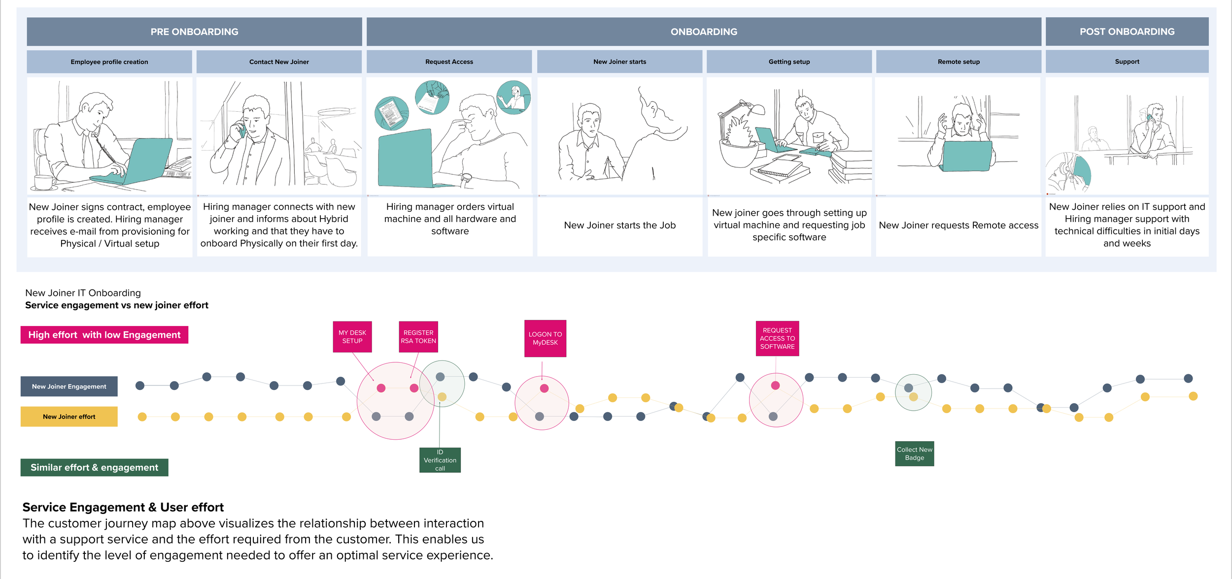 I recently completed the New Joiner IT onboarding project, which looked to gather evidence and insights of users expectations and challenges while navigating a new joiner’s IT onboarding. Through workshops with New joiners, Hiring managers and HR we captured the New joiner and Hiring manager experience in Journey maps and a Service Blueprint. In order to validate our findings from the workshops we conducted a survey with over 1000 New joiners and over 300 Hiring managers which gave us confidence that our findings were representative. Ultimately this body of work delivered prioritized areas of opportunity for improving the user experience of New joiners and Hiring managers, and will support strategic discussions on the further development of the New joiner IT onboarding experience.