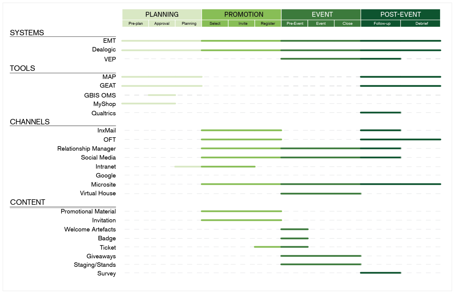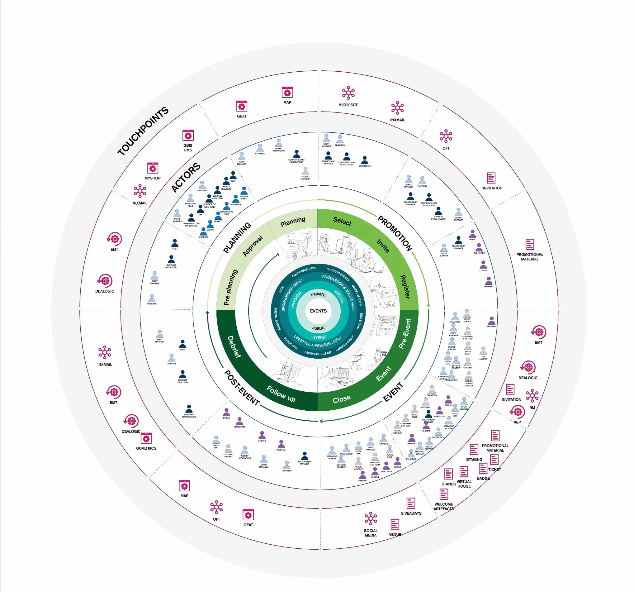 To gather insight into the current processes and workflows of events across the organisation, globally we conducted interviews with key actors and stakeholders. From these interviews we produced a series of maps, a report highlighting pains and potential opportunities. Once we presented this work we ran a series of strategic workshops to transition from the ecosystem findings to a strategic roadmap identifying short, medium and long term activities to arrive at the first version of the new events platform.