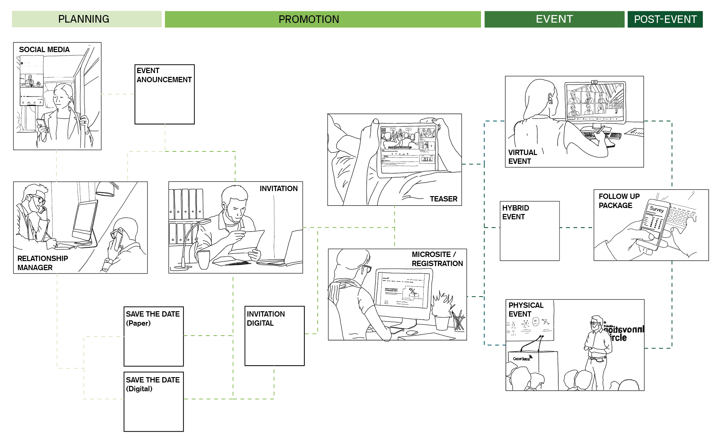 The combination of research, visualising their ecosystem through maps and storyboards then reflecting and discussing through workshops gave us and the events team a clear overview of where the opportunities were to not only build a new platform but also how to evolve events for Credit Suisse clients and event organisers.