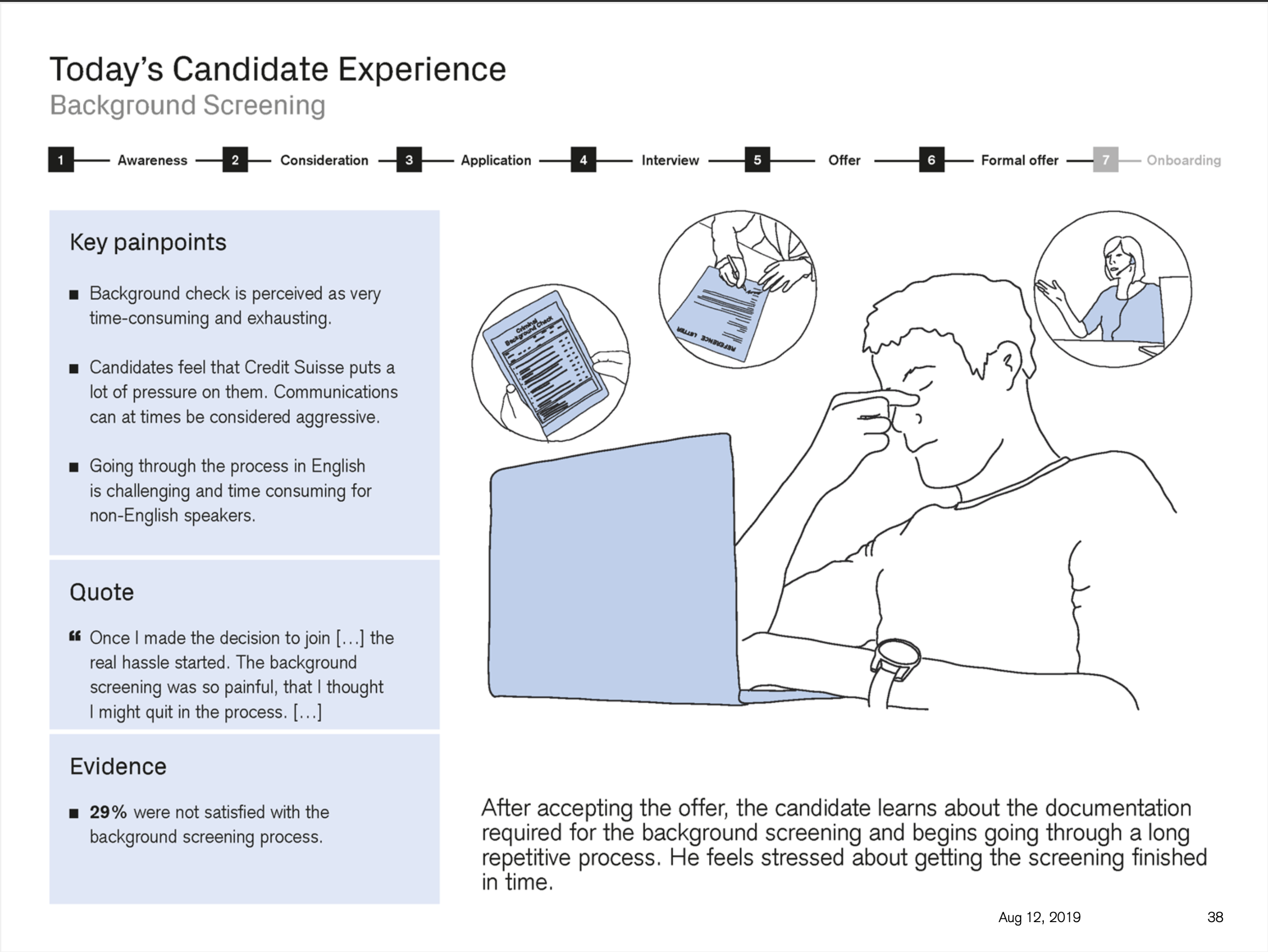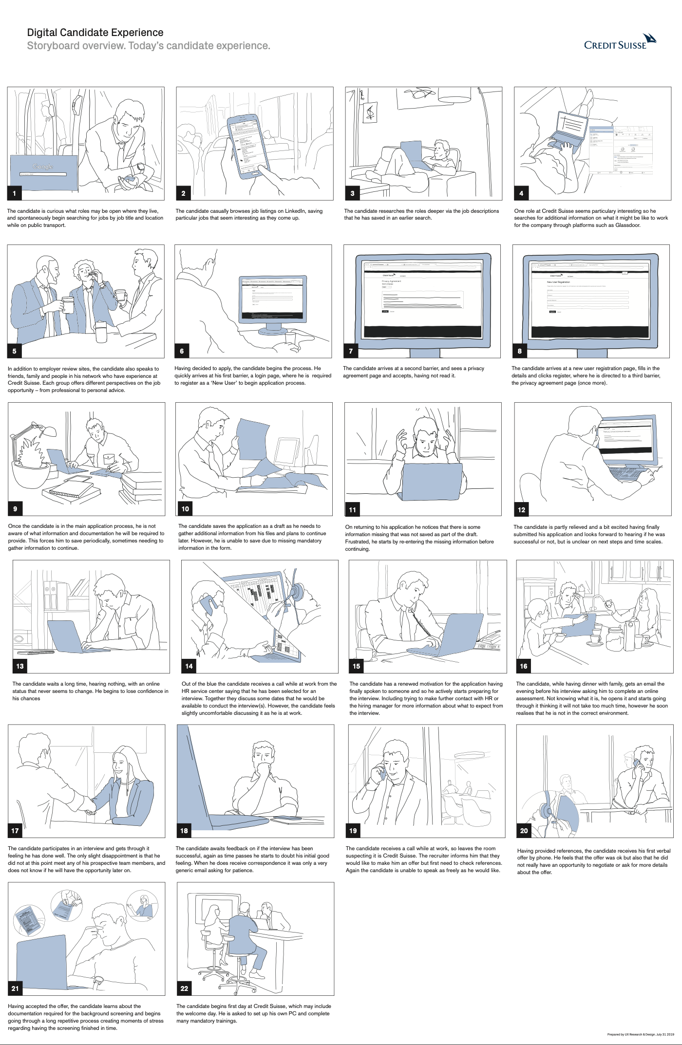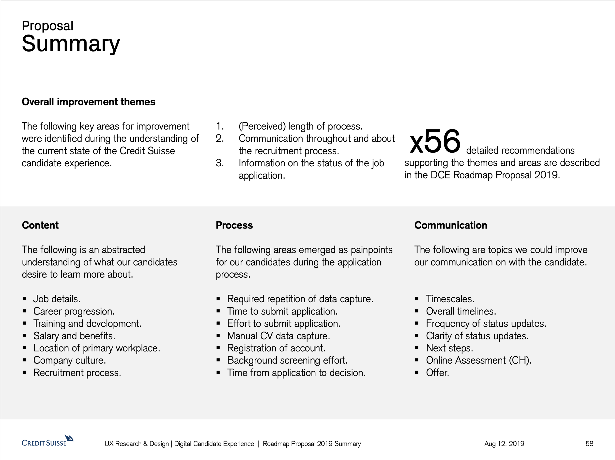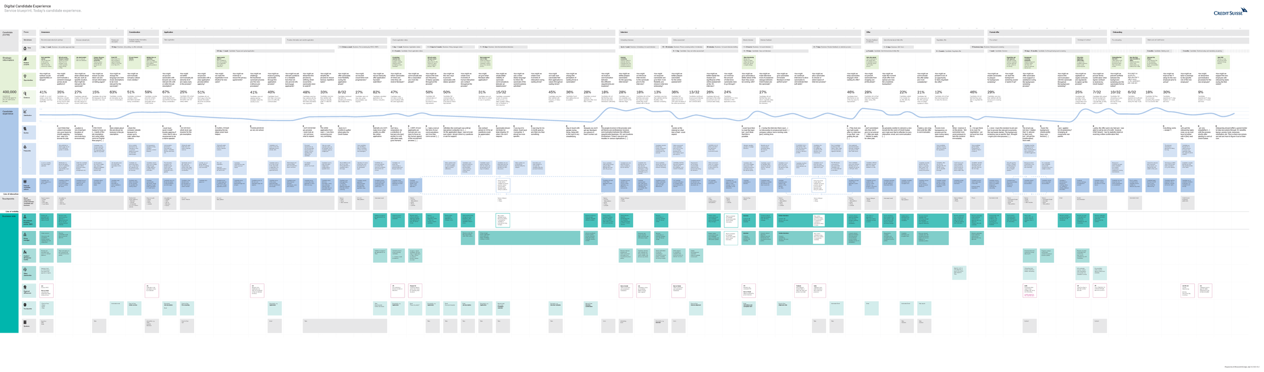 The Digital Candidate experience project set out to identify areas of the Credit Suisse candidate user journey globally that cause pain and issues for the candidates, and that therefore provide Credit Suisse with the opportunity to improve. What resulted was a vision of recommendations. A proposed strategy of how to realise those recommendations. What resulted was a host of small to large initiatives that to this day are being worked on based off this body of work.