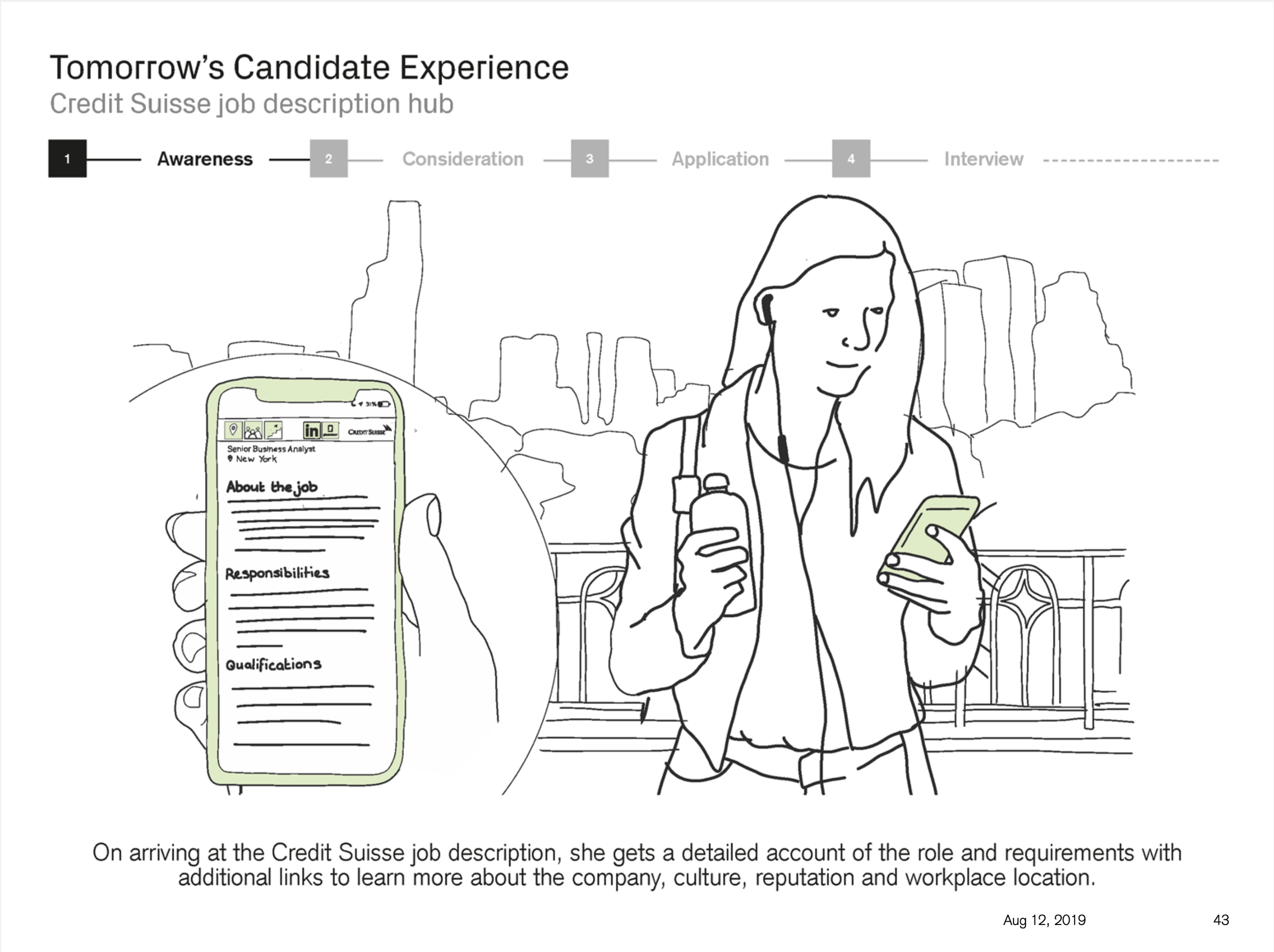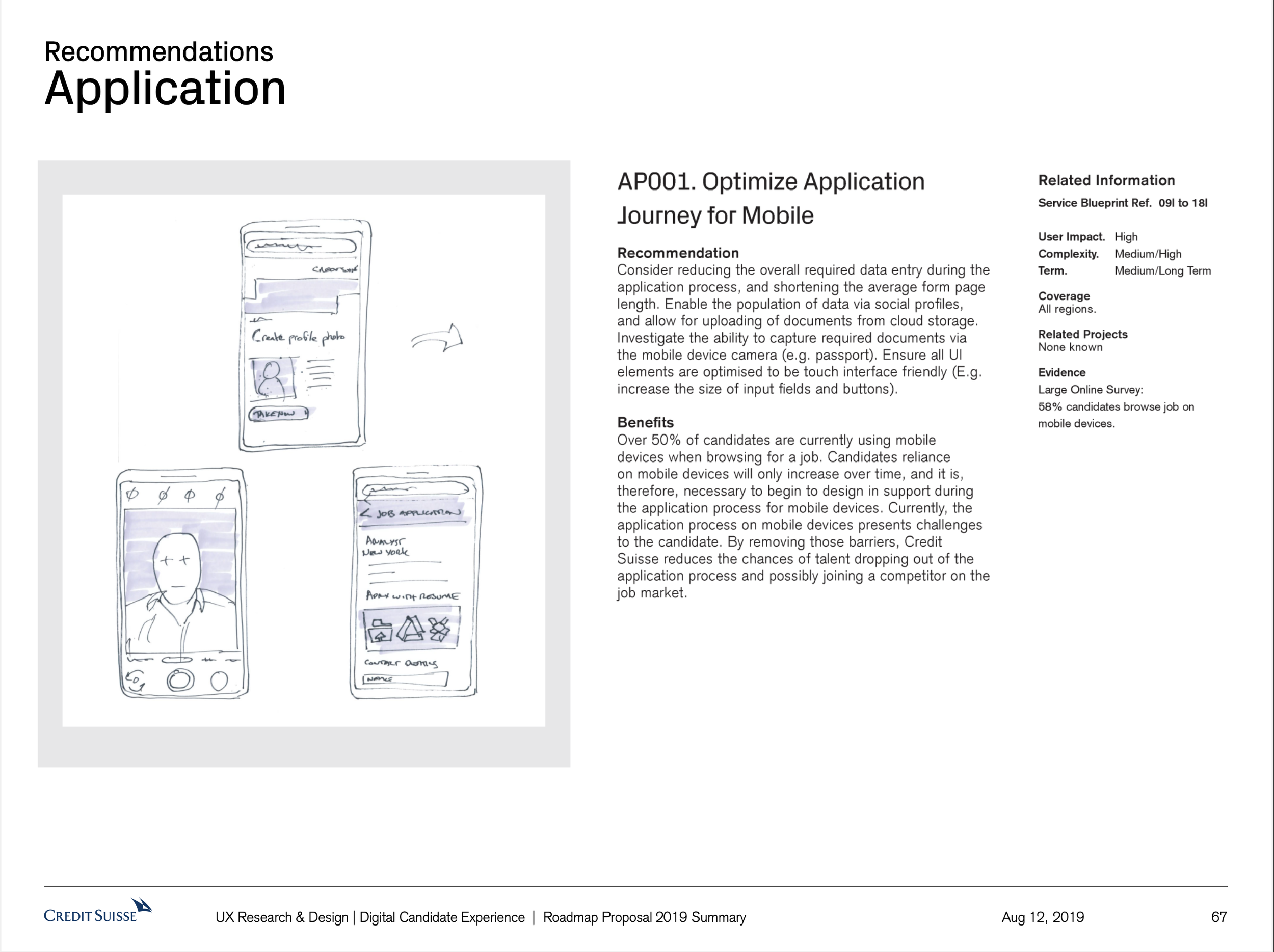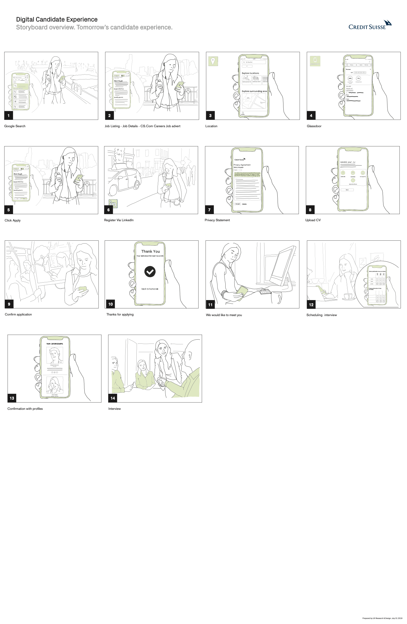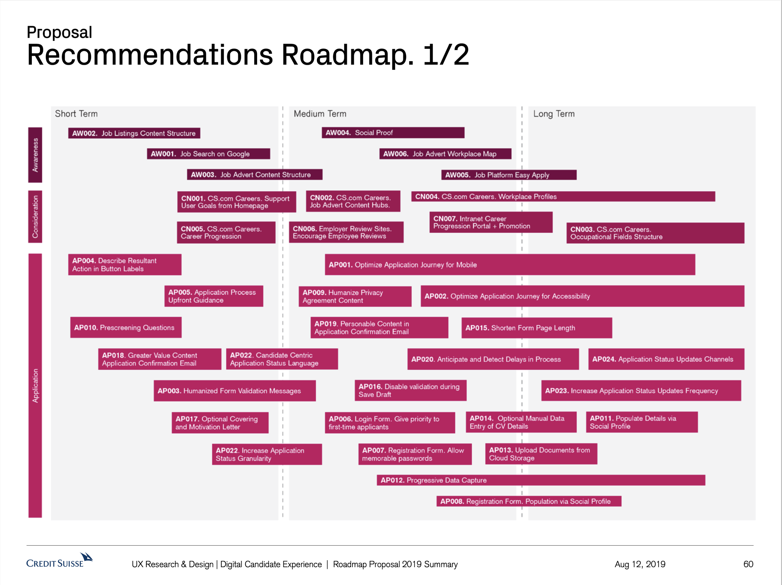 The Digital Candidate experience project set out to identify areas of the Credit Suisse candidate user journey globally that cause pain and issues for the candidates, and that therefore provide Credit Suisse with the opportunity to improve. What resulted was a vision of recommendations. A proposed strategy of how to realise those recommendations. What resulted was a host of small to large initiatives that to this day are being worked on based off this body of work.
