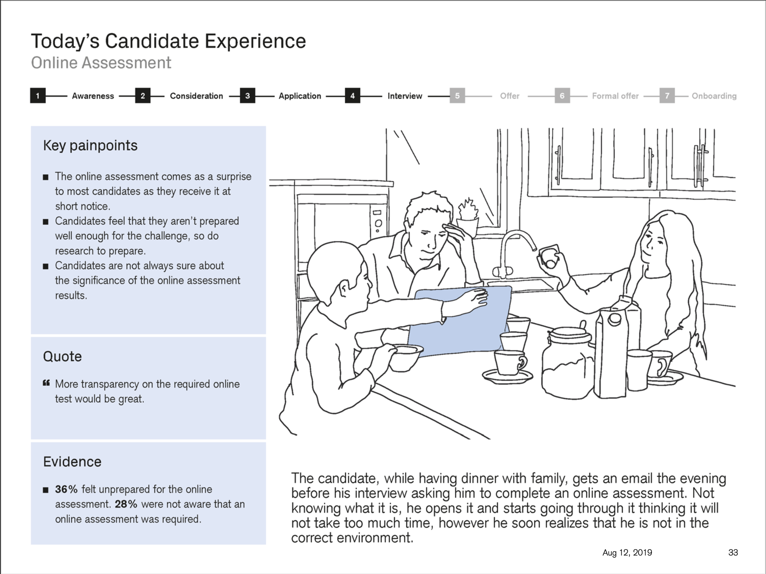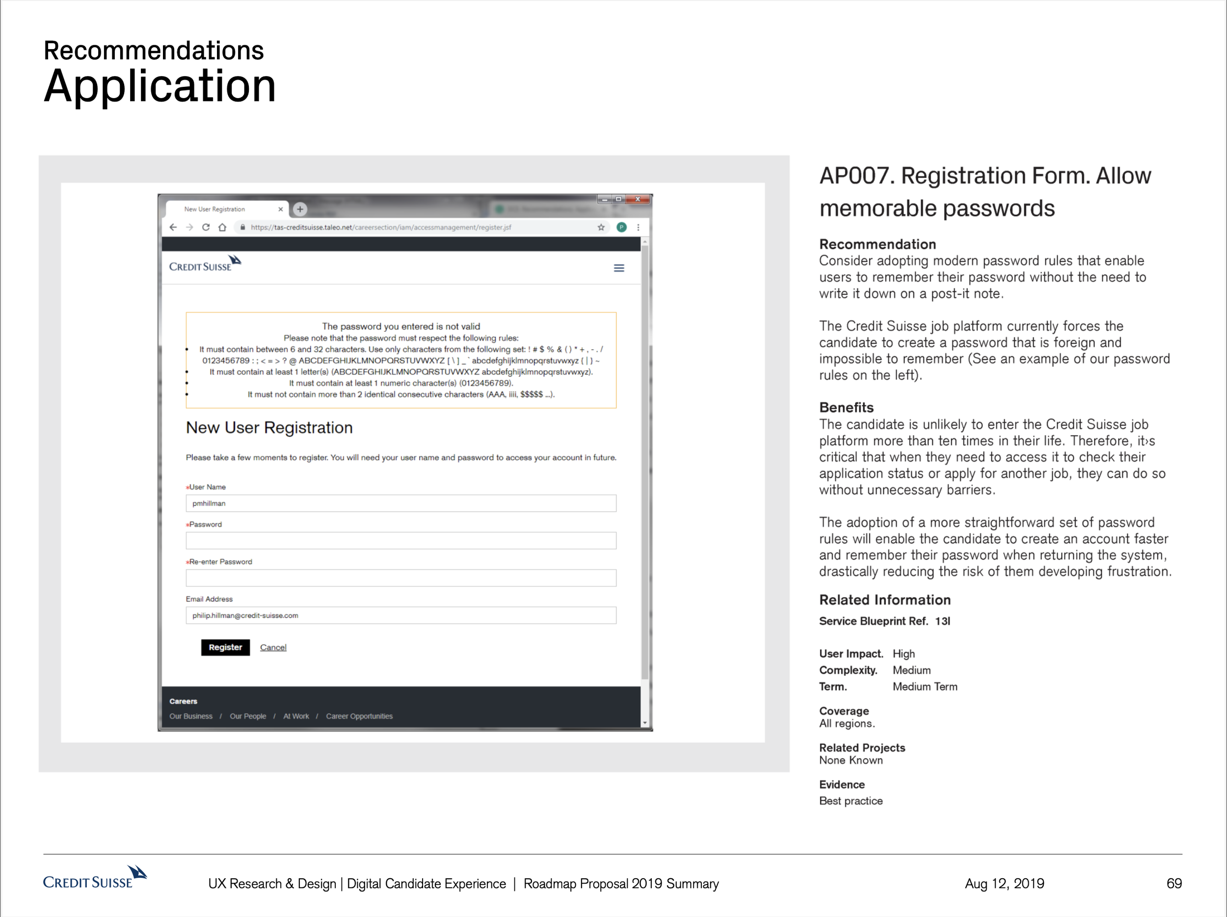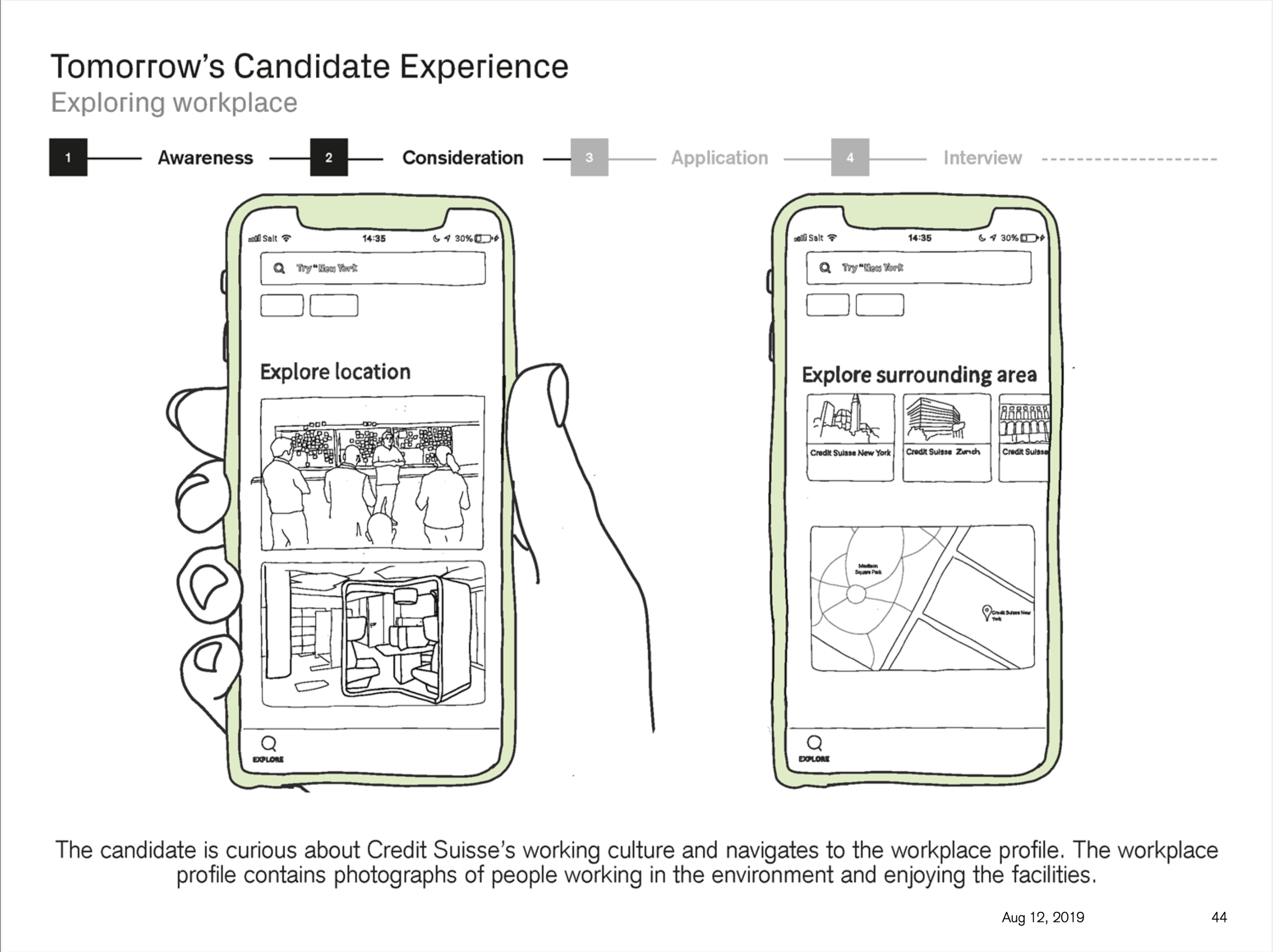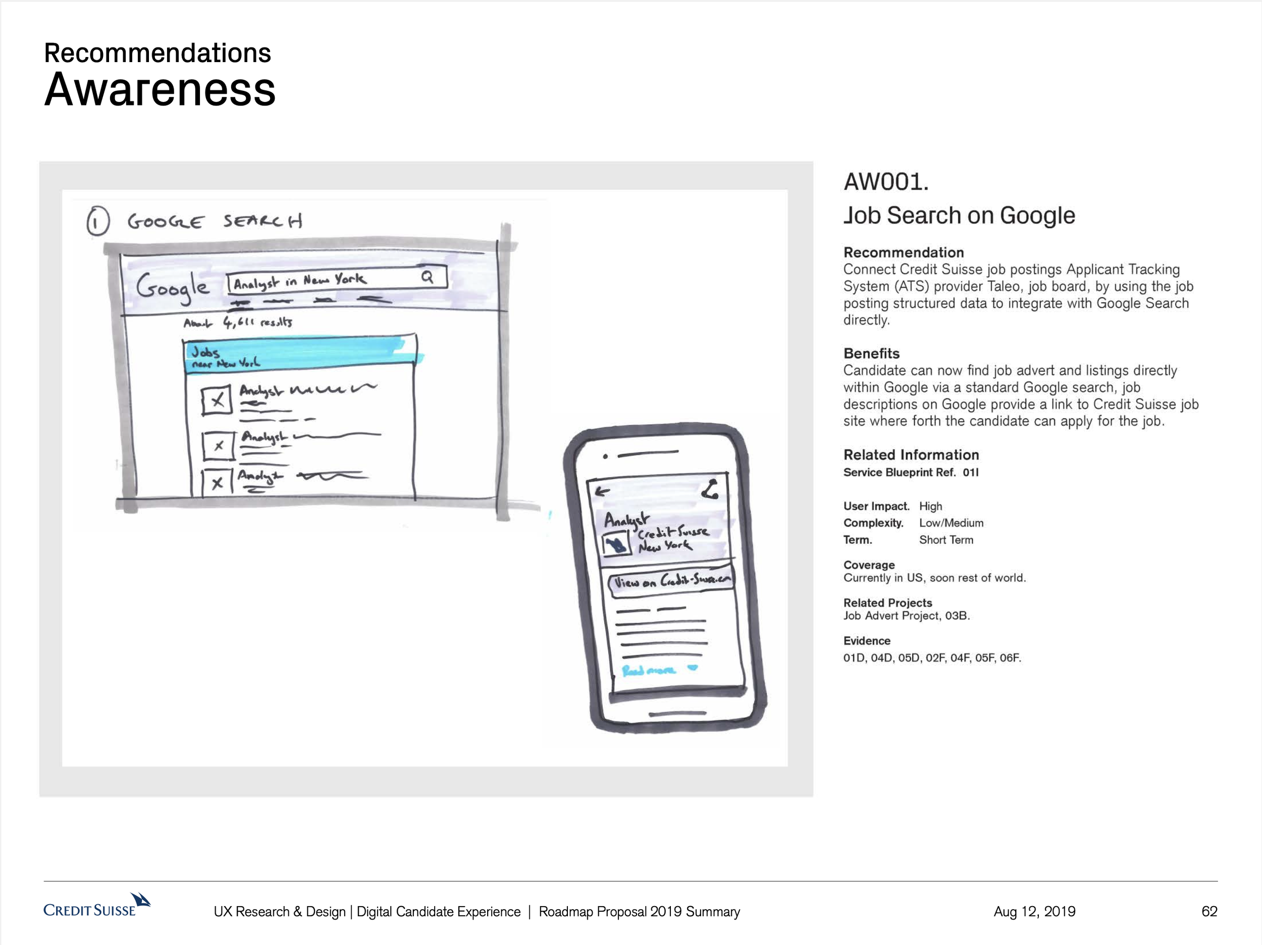 The Digital Candidate experience project set out to identify areas of the Credit Suisse candidate user journey globally that cause pain and issues for the candidates, and that therefore provide Credit Suisse with the opportunity to improve. What resulted was a vision of recommendations. A proposed strategy of how to realise those recommendations. What resulted was a host of small to large initiatives that to this day are being worked on based off this body of work.