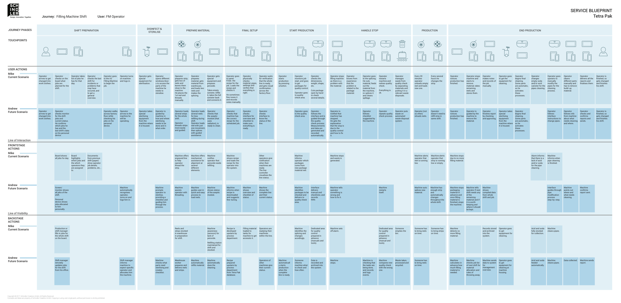 Tetra Pak approached us to help them create a vision for a future line of filling machines. We started by going to Tetra Pak clients factories to shadow and interview machine operators. We used this data to formulate the service Blueprint below which uniquely combined current and future operators.